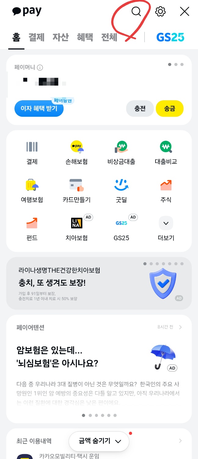 카카오톡 → 오른쪽 아래 (…) 버튼 → Pay(페이) 로 들어간 뒤