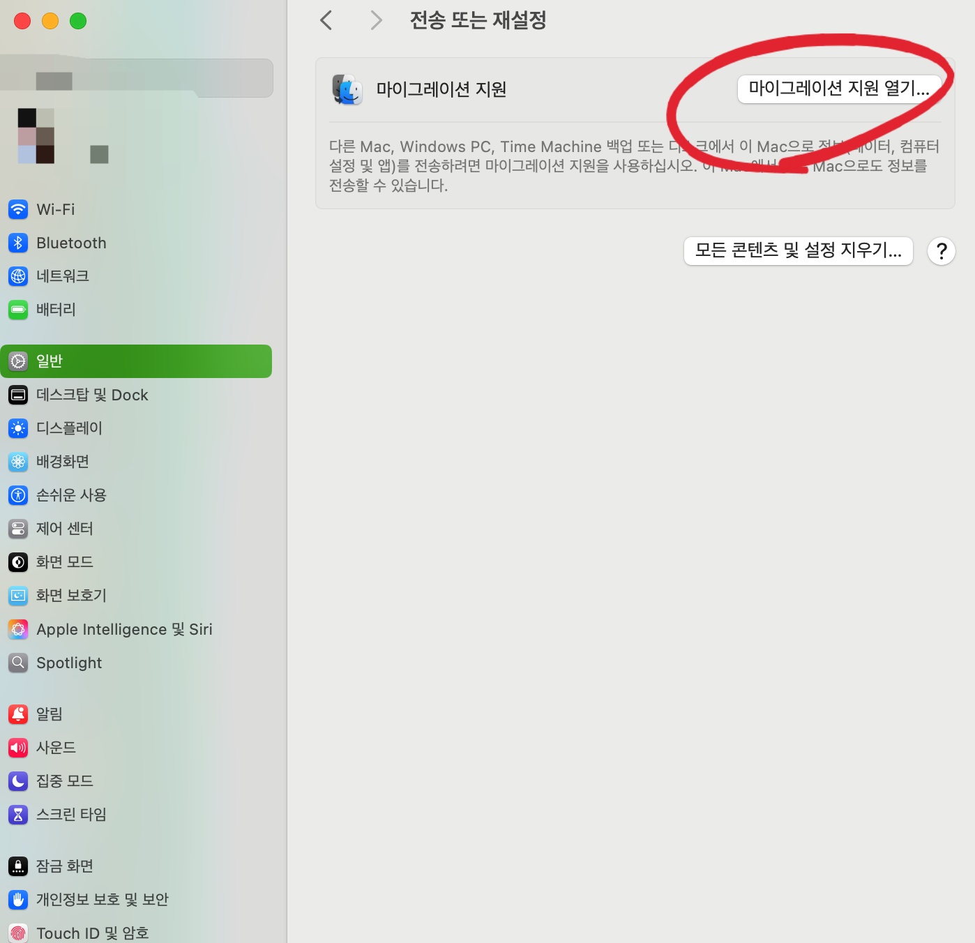 1. 맥북- 일반 → 전송 또는 재설정 메뉴 열기