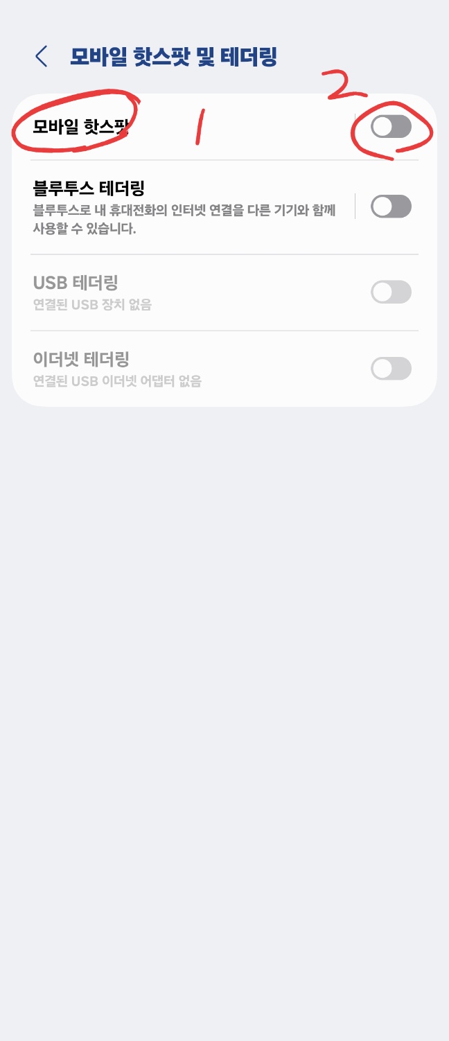 아래 화면처럼 1번을 누르면 설정을 들어갈 수 있고, 2번을 누르면 핫스팟 기능이 활성화 됩니다.