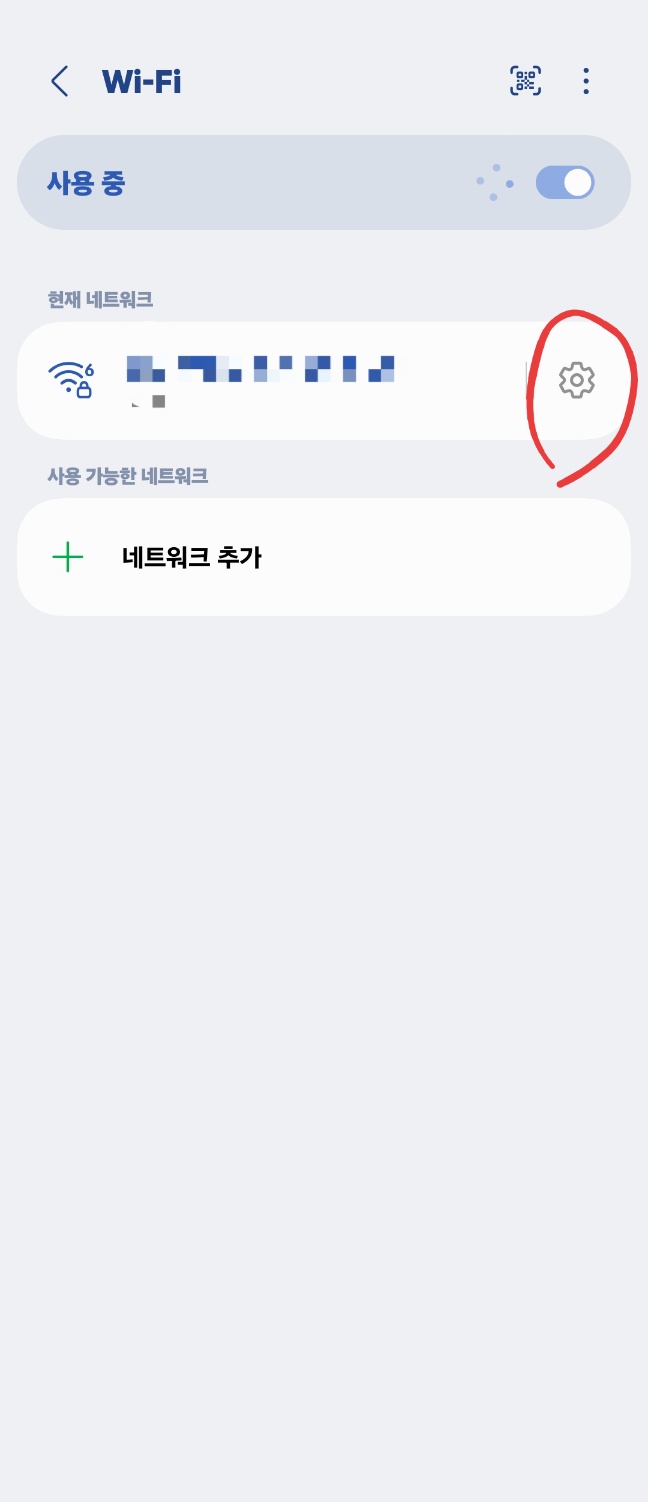 2. 연결된 와이파이의 톱니바퀴 모양 아이콘을 찾습니다.